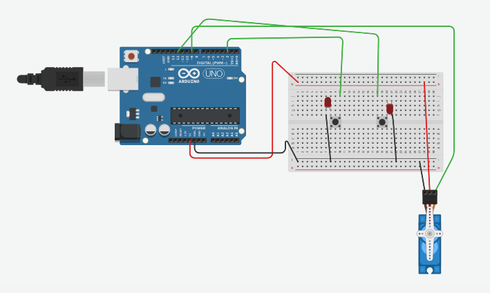 At the beginning the circuit didn´t work correctly, it was thought it was due to a problem with the code. But through continuous testing it was determined that the circuit was at failure. The connection of the buttons have to be set in a way in which the circuit can be completed, however it is not possible to determine this visually on TinkerCad. Therefore to see the correct connection of the circuit, the testing each side of the button with a LED connected to the circuit was performed. This allowed to see the correct connection, as the LED will turn on (slightly) when connected properly.